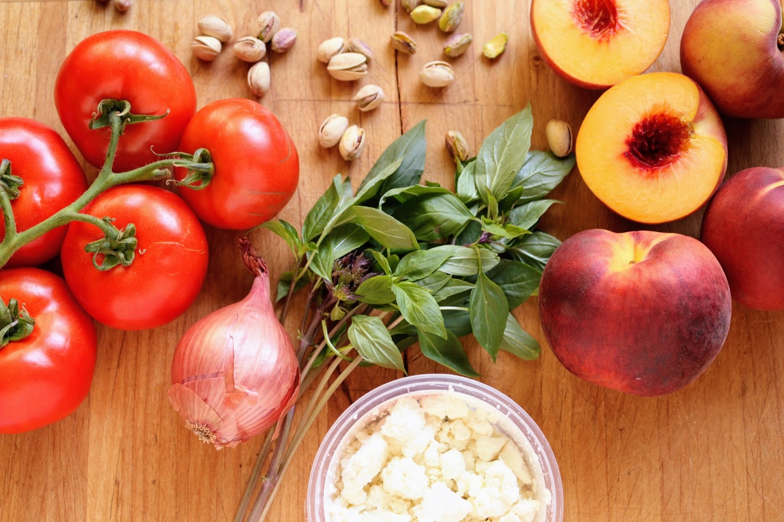 | Tomatoes, shallots, pistachios, Thai basil, chevre cheese, and peaches |